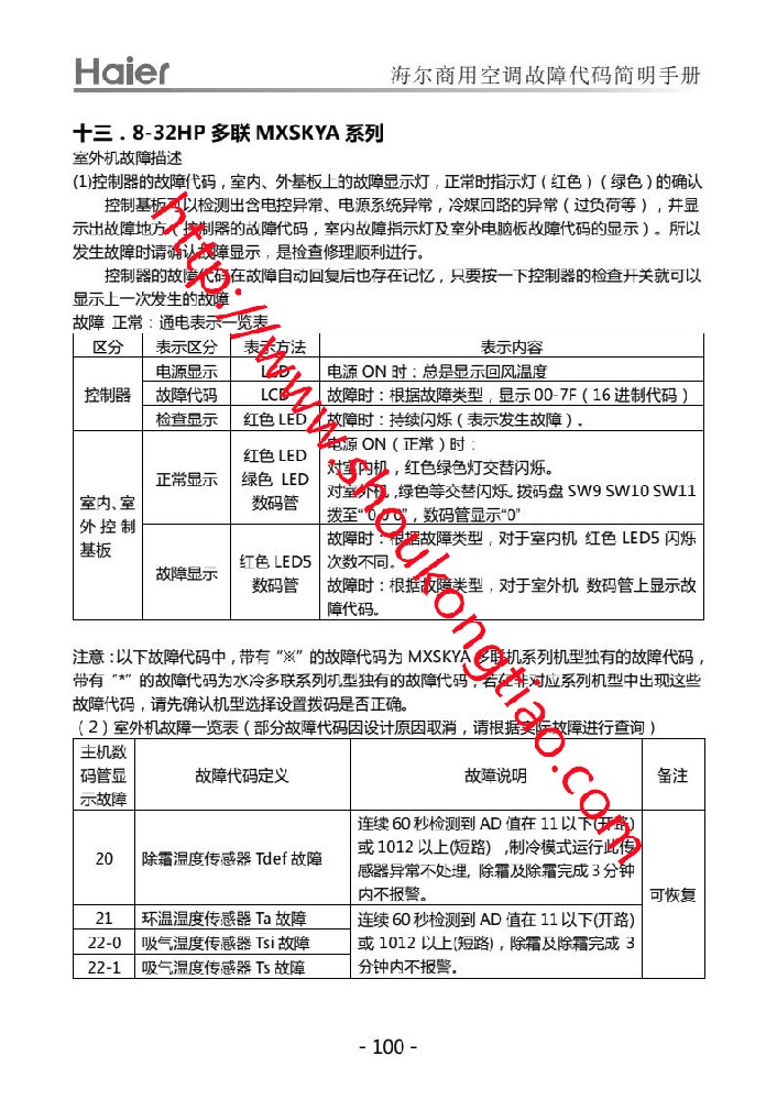 8-32HP多联MXSKYA 系列室外机故障描述控制器的故障代码,室内、外基板上的故障显示灯,正常时指示灯(红色)(绿色)的确认 控制基板可以检测出含电控异常、电源系统异常,冷媒回路的异常(过负荷等),并显 示出故障地方(控制器的故障代码,室内故障指示灯及室外电脑板故障代码的显示)。所以 发生故障时请确认故障显示,是检查修理顺利进行。